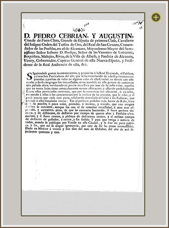 1743-10-26 Siguiéndose graves inconvenientes y perjuicios a la real hacienda, al público y a muchos particulares del uso que se ha introducido de rifarse privadamente prendas y preseas de valor en algunas casas de esta ciudad, en donde con este título y fin se congregan los interesados, atravesándose en este género de comercio una paliada usura, vendiendo en precio excesivo por más de su justo valor aquello que en venta lícita tiene conocidamente menor estimación; y estando prohibido por leyes estos perniciosos contratos, que por su naturaleza son usurarios o viciosos, atrayendo a ellos a los concurrentes por la codicia de las prendas que se rifan y el poco precio que cada uno pone, resultando demasiada utilidad a los factores que excitan a estas simuladas ventas; por el presente prohibo toda suerte de rifas, bien sean de mucho o poco valor, privadas o secretas, y mando que con ningún motivo se ejecuten, aunque sea con el de remediar necesidad u otro más espacioso y caritativo, pena de que lo contrario haciendo, si fuere persona decente y de distinción, de destierro por tiempo de cuatro años a presidio ultramarino, y si fuere común y plebeya de doscientos azotes y el mismo tiempo de destierro de gastador, a ración y sin sueldo. Y para que venga a noticia de todos, mando se publique por bando en esta ciudad y se fije en parte pública, a fin que no se alegue ignorancia, por haber de ser las penas irremisibles. Dado en México a veinte y seis días del mes de octubre del año de mil setecientos cuarenta y tres.